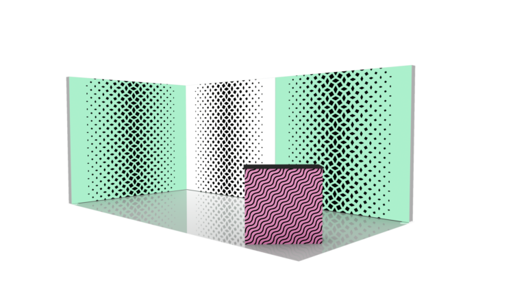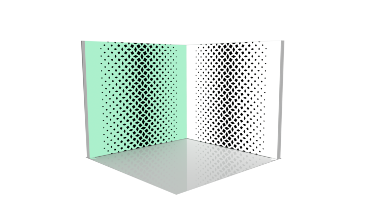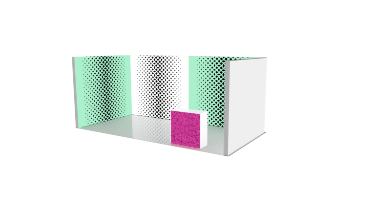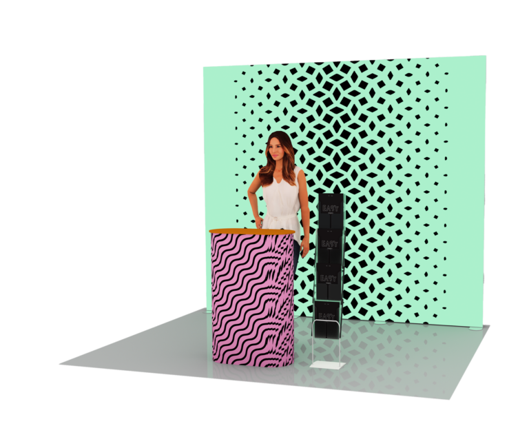 Stand de 9m2 ouvert sur 2 côtés avec 6m de cloison, composé de 2 caissons lumineux. Impression recto sur tissu. Fournis avec un sac de transport.