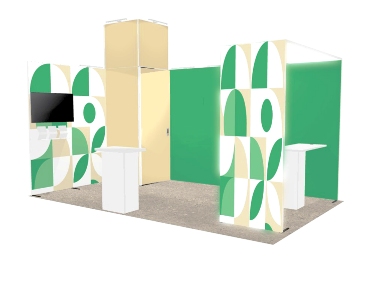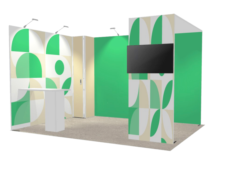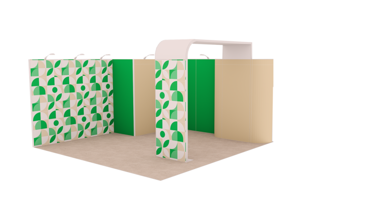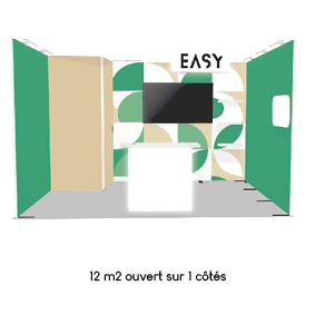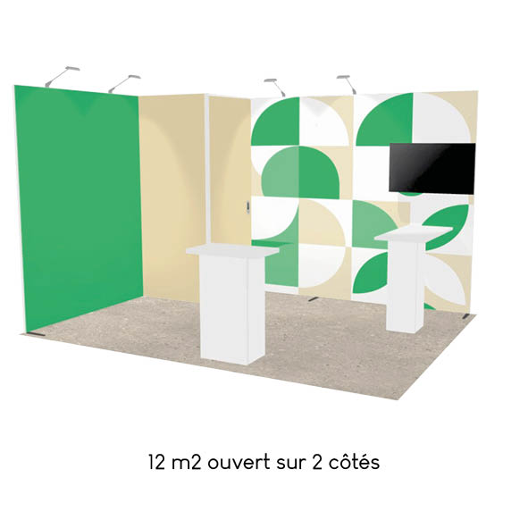 Stand de 12m2 ouvert sur 2 côtés avec 7m de cloison sublimée, un placard, une arche, une console, des spots LED et (Ecran en option).