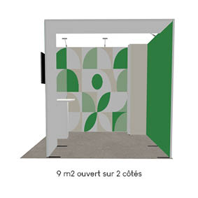 Stand de 9m2 ouvert sur 1 côté avec 9m de cloison, une réserve et des spots LED.