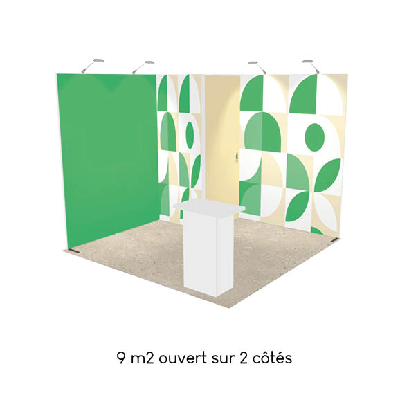 Stand de 9m2 avec 6m de cloison sublimée, ouvert sur 2 côtés, avec une réserve, un comptoir simple et 4 spots LED.