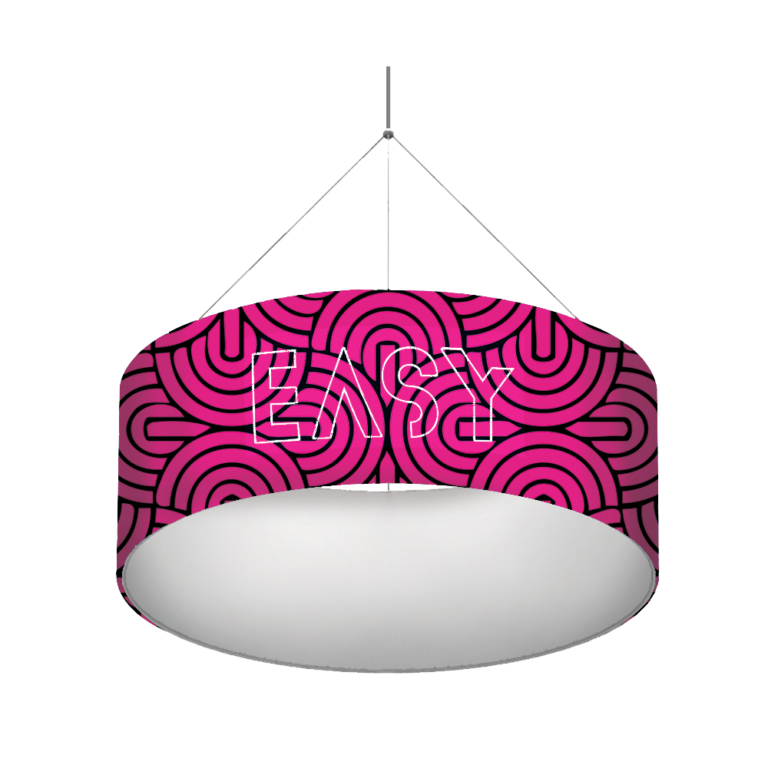 Enseigne circulaire suspendue, structure tubulaire en aluminium, disponible en 3 diamètres, avec hauteurs adaptées pour un impact visuel optimal. Légère et facile à transporter