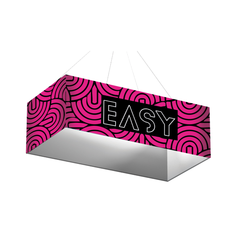 Enseigne rectangle suspendue, structure tubulaire en aluminium, disponible en 3 formats pour un impact optimal. Visuel recto verso sur housse en tissu. Facile à transporter.