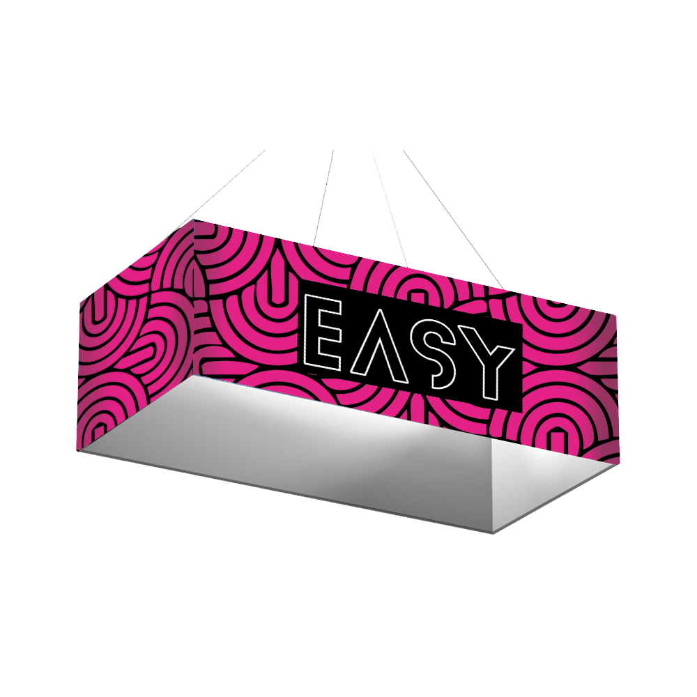 Enseigne rectangle suspendue, structure tubulaire en aluminium, disponible en 3 formats pour un impact optimal. Visuel recto verso sur housse en tissu. Facile à transporter.