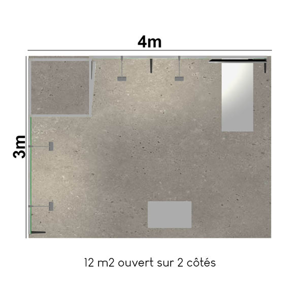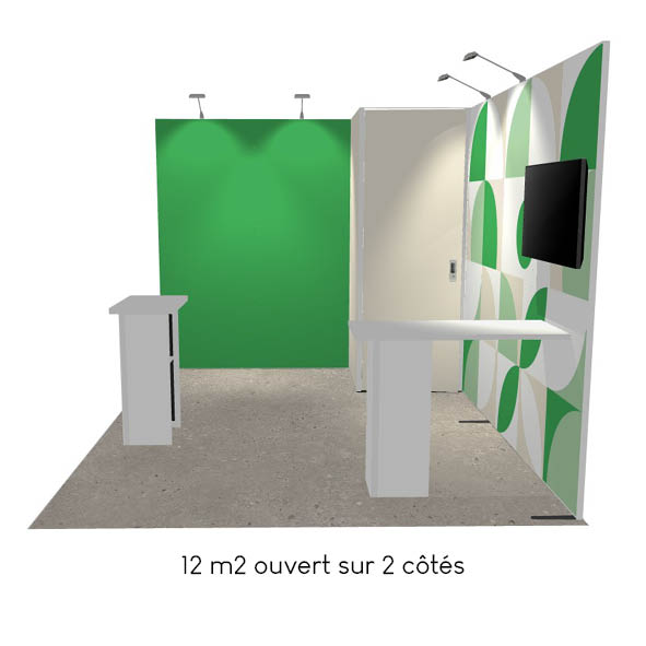 Stand de 12m2 ouvert sur 2 côtés avec 7m de cloison sublimée, avec une réserve et un comptoir, une console, des spots LED (Ecran en option).