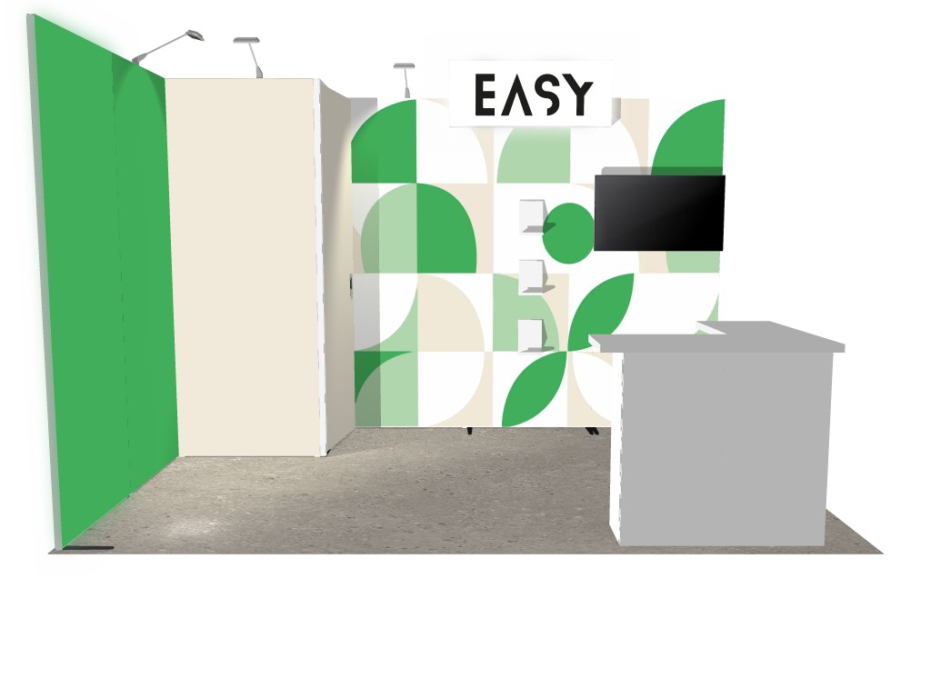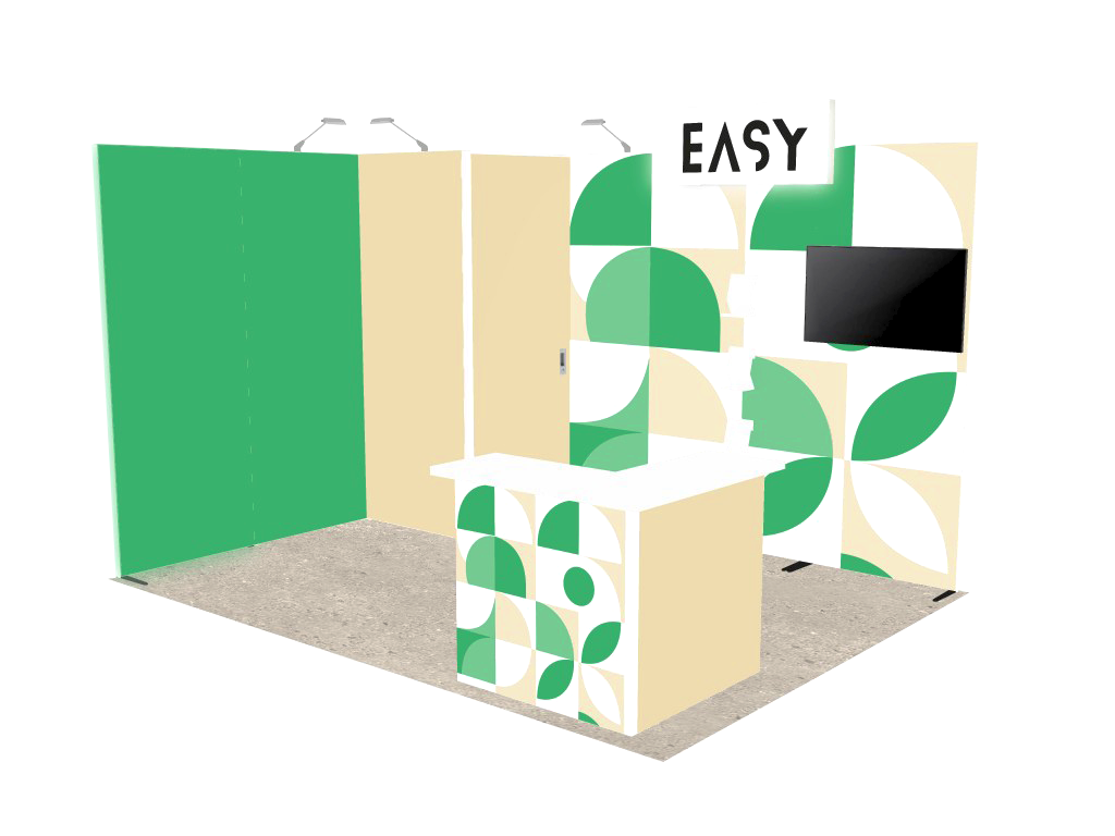 Stand de 12m2 ouvert sur 2 côtés avec 7m de cloison, composé de 3 caissons lumineux. Impression recto sur tissu. Fourni avec un sac de transport. (Hors Comptoir)