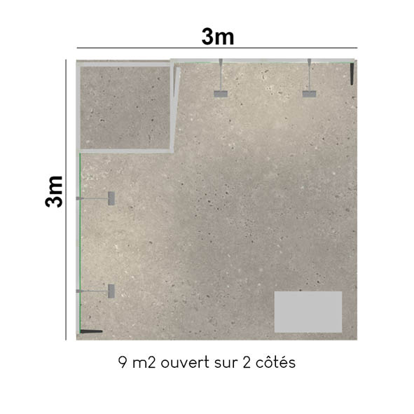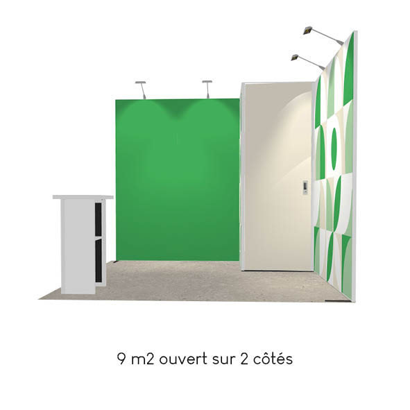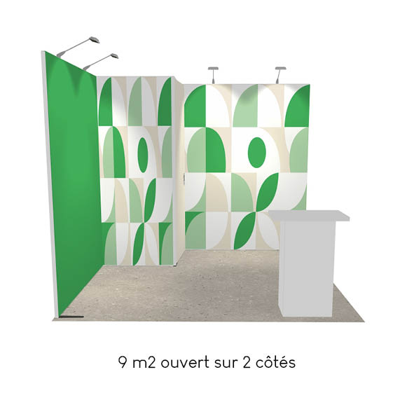 Stand de 9m2 avec 6m de cloison sublimée, ouvert sur 2 côtés, avec une réserve, un comptoir simple et 4 spots LED.