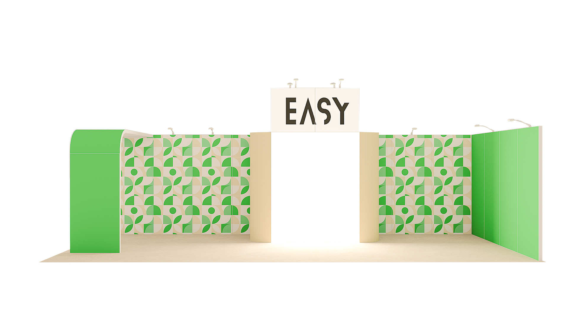 Stand de 9m2 ouvert sur 2 côtés avec 6m de cloison, composé de 2 caissons lumineux. Impression recto sur tissu. Fournis avec un sac de transport.