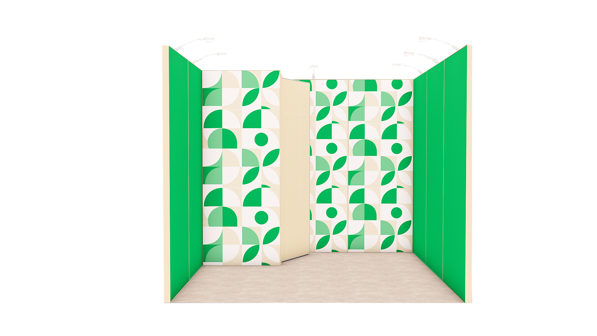 Stand de 12m2 ouvert sur 2 côtés avec 7m de cloison sublimée, un placard, une arche, une console, des spots LED et (Ecran en option).
