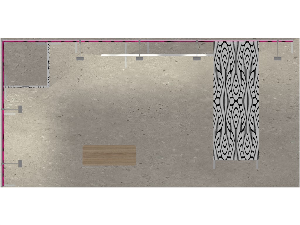Stand de 18m2 ouvert sur 2 côtés avec une réserve réhaussée, une arche, un comptoir simple et des spots LED. Cloison inclinée non incluse.