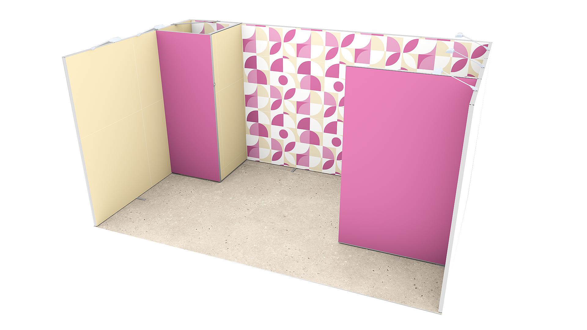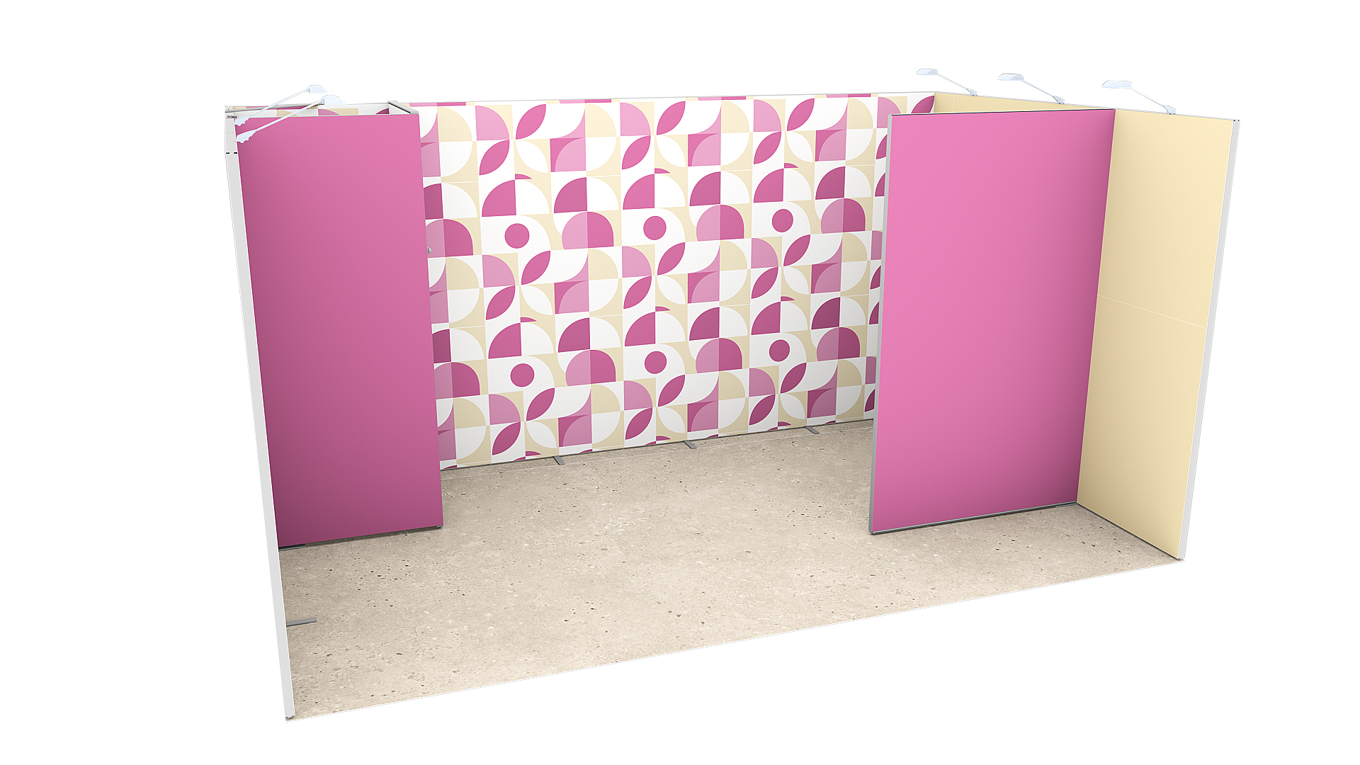 Stand de 15m2 ouvert sur 1 côté avec 11m de cloison, une réserve, spots fournis. Entièrement personnalisable. Sac de transport fournis