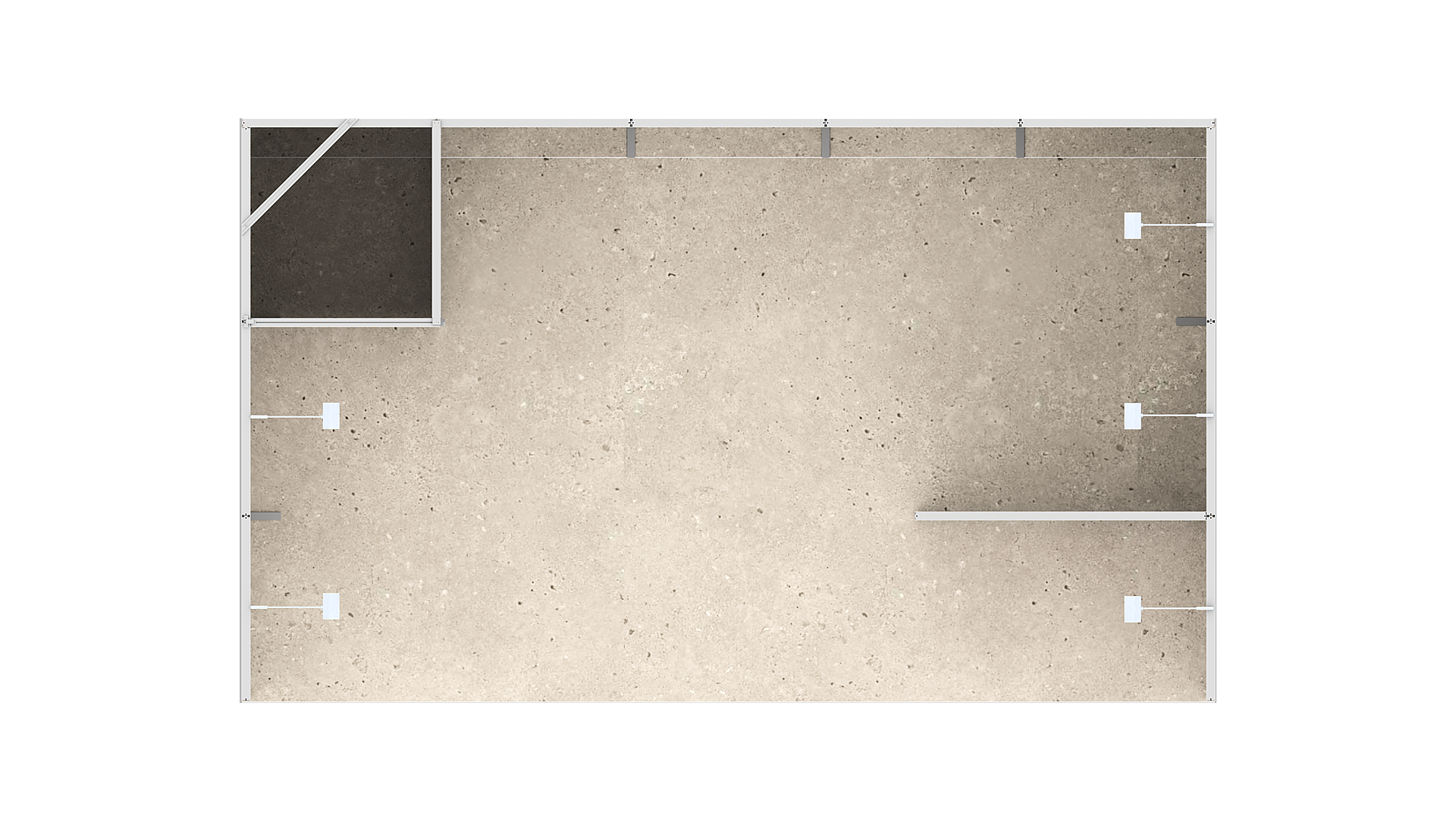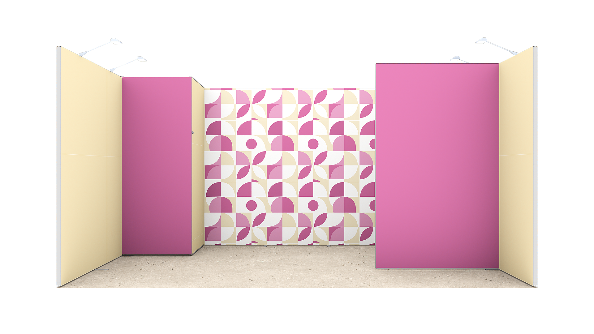 Stand de 18m2 ouvert sur 2 côtés avec une réserve réhaussée, une arche, un comptoir simple et des spots LED. Cloison inclinée non incluse.
