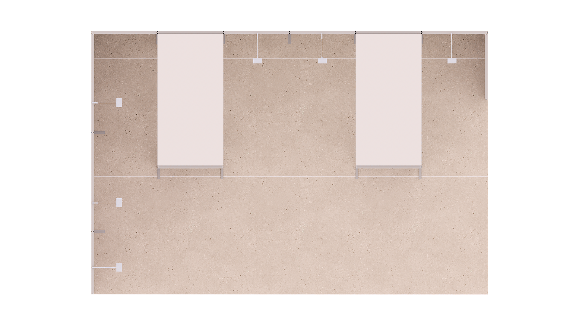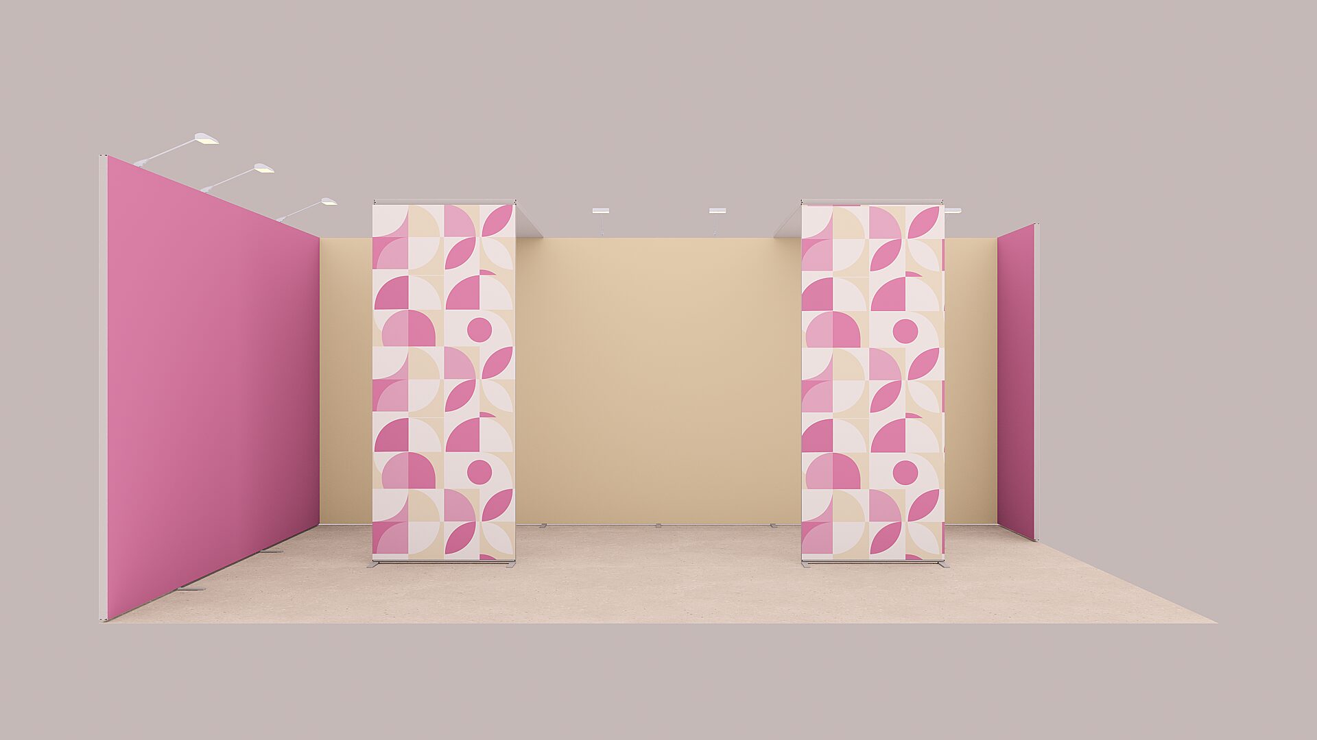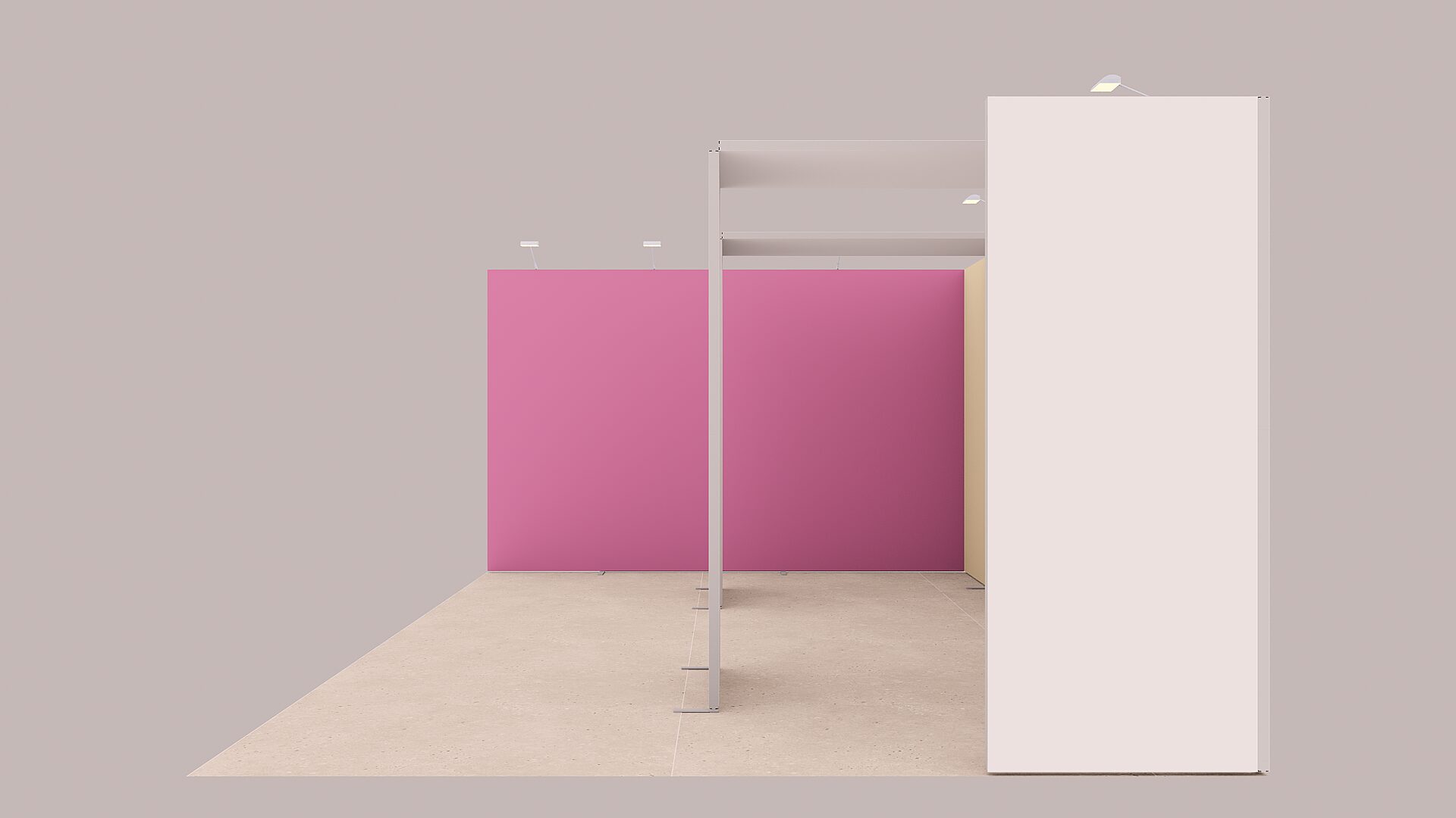 Stand de 18m2 ouvert sur 2 côtés avec une réserve réhaussée, une arche, un comptoir simple et des spots LED. Cloison inclinée non incluse.